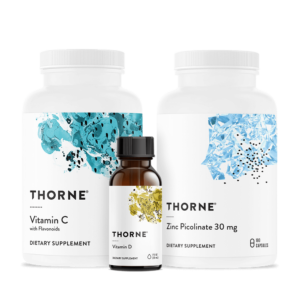 Thorne’s Immune Support Stack contains three products that provide comprehensive immune support – Vitamin D Liquid, Zinc Picolinate 30 mg, and Vitamin C with Flavonoids.